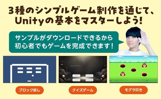 まったくの初心者がゲーム開発にチャレンジするとき、もっとも挫折しがちなポイントが「プログラミング」です。本書では、ゲームを完成させる楽しさを感じてもらうことを優先し、プログラミングの説明は、あえて最小限。購入者特典のダウンロードデータを使えば、誰でも3種のゲーム(ブロック崩し、クイズゲーム、モグラ叩き)を作ることができます。