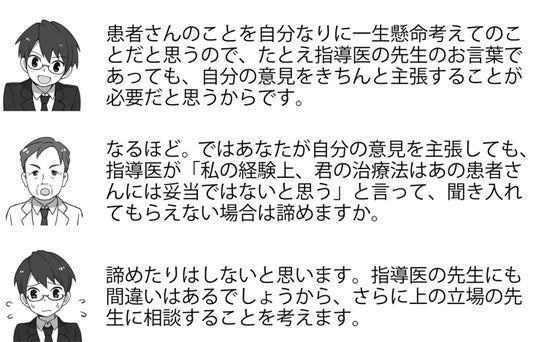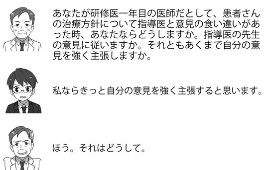 実際の面接は、面接官が笑顔のまま進んでいったそうですが、ほとんどの場合、この時点で合格させるべきではないと判断されます。実際の医療現場は単純ではないでしょうが、自分の意見を通すためには手段を選ばないような人と働きたいと思う人は珍しいはずです。