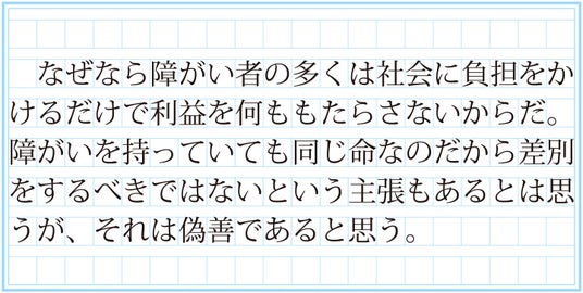 大学入試の小論文では、論理が通っていれば基本的に何を書いてもいいとされていますが、じつは医学部入試では、答案に書くことで不合格になる恐れのある内容があります。まず1つ目は「差別」や「生命の軽視」です。例えば、答案のなかに次のような文章があったとします。