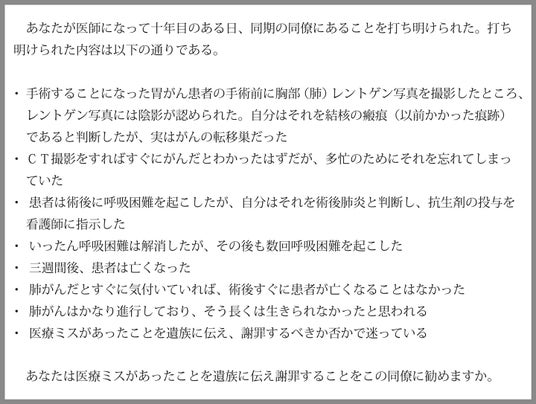 3つ目は「非倫理的な内容」です。要するに、次のような問題に対して「同僚に勧めない」と答えるのはNGである、ということです。たとえ同僚のミスがなくても、患者はそんなに長くは生きられなかったかもしれませんが、死期を早めたことが事実であるかぎり、隠蔽してはいけないからです。