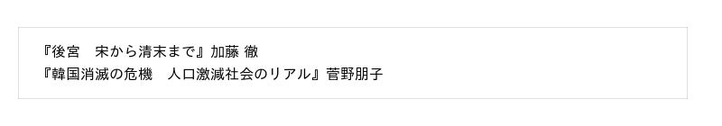 巨大な密室から歴代王朝の興亡を描く『後宮 宋から清末まで』(加藤 徹)、ソウル在住の記者が日本人の知らない実情をレポートする『韓国消滅の危機 人口激減社会のリアル』(菅野朋子)が登場! ぜひこの機会にお手に取りください。