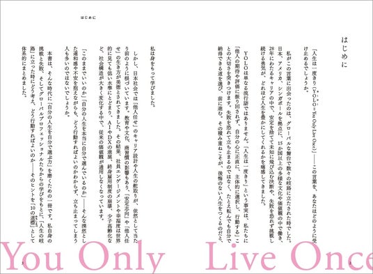 「YOLO=You Only Live Once(人生は一度きり)」=「他人の期待や評価に振り回されず、自分の心に正直に、主体的に選択し、行動する」という価値観を軸に、グローバル企業で活躍するプロフェッショナルたちの実例や著者自身の挑戦と成功のストーリーを、意志決定のヒント=「10の道標」として体系的に解説します。