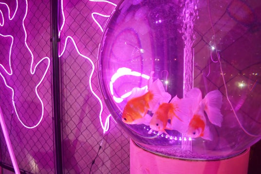 本展示は、春の桜とディスコカルチャーを融合させ、バルーンで再現した花吹雪と、ディスコボールの輝きが織りなす幻想的な空間を演出。さらに、桜の名を持つ金魚たちが泳ぐ優美な世界が広がります。