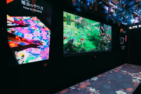 現代の技術を用いたインタラクティブな金魚すくいとおみくじを融合。手のひらの上に金魚をすくうと、おみくじが現れます。