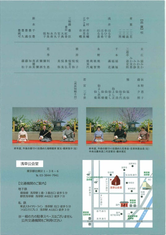 【出演流派】青葉、浅井、江戸小歌、三味線豊臣、新水、末広、千本、永野、端唄根岸、花季、藤本、雅、若宮の13流派から60番を予定。