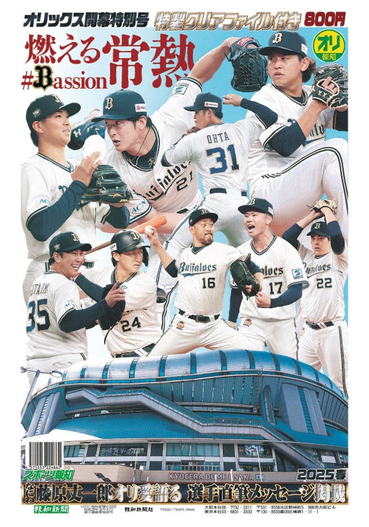 タブロイド新聞「2025オリックス開幕特別号」(オールカラー24ページ+抜き取り8ページ、特製クリアファイル付き、税込み800円)を21日から発売します。2年ぶりのV奪回を目指すナインの直筆メッセージと本紙カメラマン撮影のベストショット、山崎颯一郎投手の独占コラム「人生一度きり」、熱狂的なオリックスファンで知られるなにわ男子・藤原丈一郎さんの特別手記など企画満載。この特別号でしか手に入らない特製クリアファイルも入っています。球団直営店「Bs SHOP」(京セラドーム大阪内)、「BーWAVE」(神戸・三宮)などのほか、24日午前11時から大阪本社販売局ネットショップ(https://hochiーosakahanbai.com/)でも購入可能です。