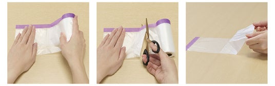 「片付け簡単広がるシート」使い方ステップ 左から:「貼る」⇒「カットする」⇒「シートを広げる」