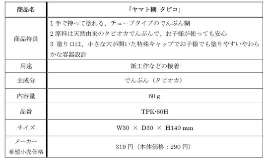 「ヤマト糊 タピコ」は、手を汚さず容器から直接塗ることができるチューブタイプのでんぷん糊です。塗り口は、小さな穴が開いた特殊キャップとし、お子様でも塗りやすいやわらかな容器設計で、スムーズに糊を塗り広げることができます。『手で直接塗りたくないけれど安心な素材の糊を使いたい、使わせたい』といった一定数のお客様の声から生まれました。原料は『ヤマト糊』同様、天然由来のタピオカでんぷんを使用し、安心してご利用いただけます。