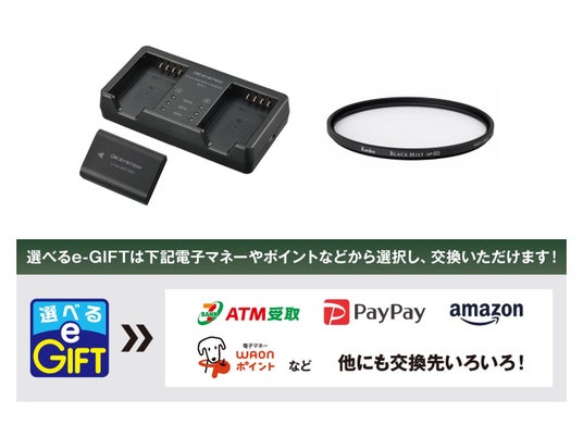 さらに、対象のカメラとレンズを購入&同時申込みいただいた方には、追加で「選べるe-GIFT」(10,000円分)をもれなくプレゼントいたします。