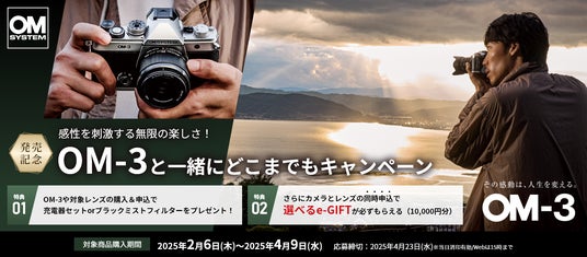 OMデジタルソリューションズ株式会社が展開する映像製品ブランド「OM SYSTEM」は、ミラーレス一眼カメラ「OM SYSTEM OM-3」の発売を記念して、対象商品をお買い上げいただいたお客さまを対象とした『感性を刺激する無限の楽しさ!OM-3と一緒にどこまでもキャンペーン』を2025年2月6日(木)より実施します。