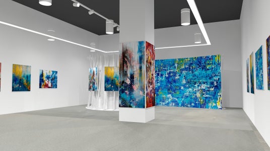 真田が描く「新しい風景」は、窓のように作品と鑑賞者の間に空間を創出し、鑑賞者を包み込むように上へ上へと伸びていく作品は、見る者との対話を生み出します。真田がこれまで制作してきたパブリックアートの多くは、その地で人々を繋いでいく絵画の力を、変容しながらもそこにあり続ける風景として展示されています。本展覧会では、大作のほかに大型立体インスタレーション作品の展示を行い、「新しい風景」に没入できる空間を作り出します。