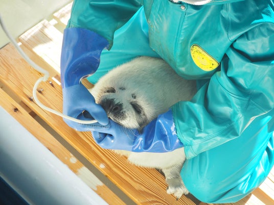 砂浜で動けなくなっているクラカケアザラシの赤ちゃん