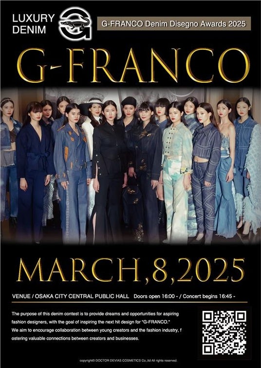 ドクターデヴィアス化粧品株式会社が展開するLUXURY DENIMブランド「G-FRANCO」は、若手デザイナーの才能を発掘するデニムデザインコンテスト「G-FRANCO Denim Disegno Awards 2025」の最終審査会を、2025年3月8日(土)、大阪市中央公会堂にて開催します。次世代のデニムファッションを担う16作品が、ファッションショー形式で披露されます。