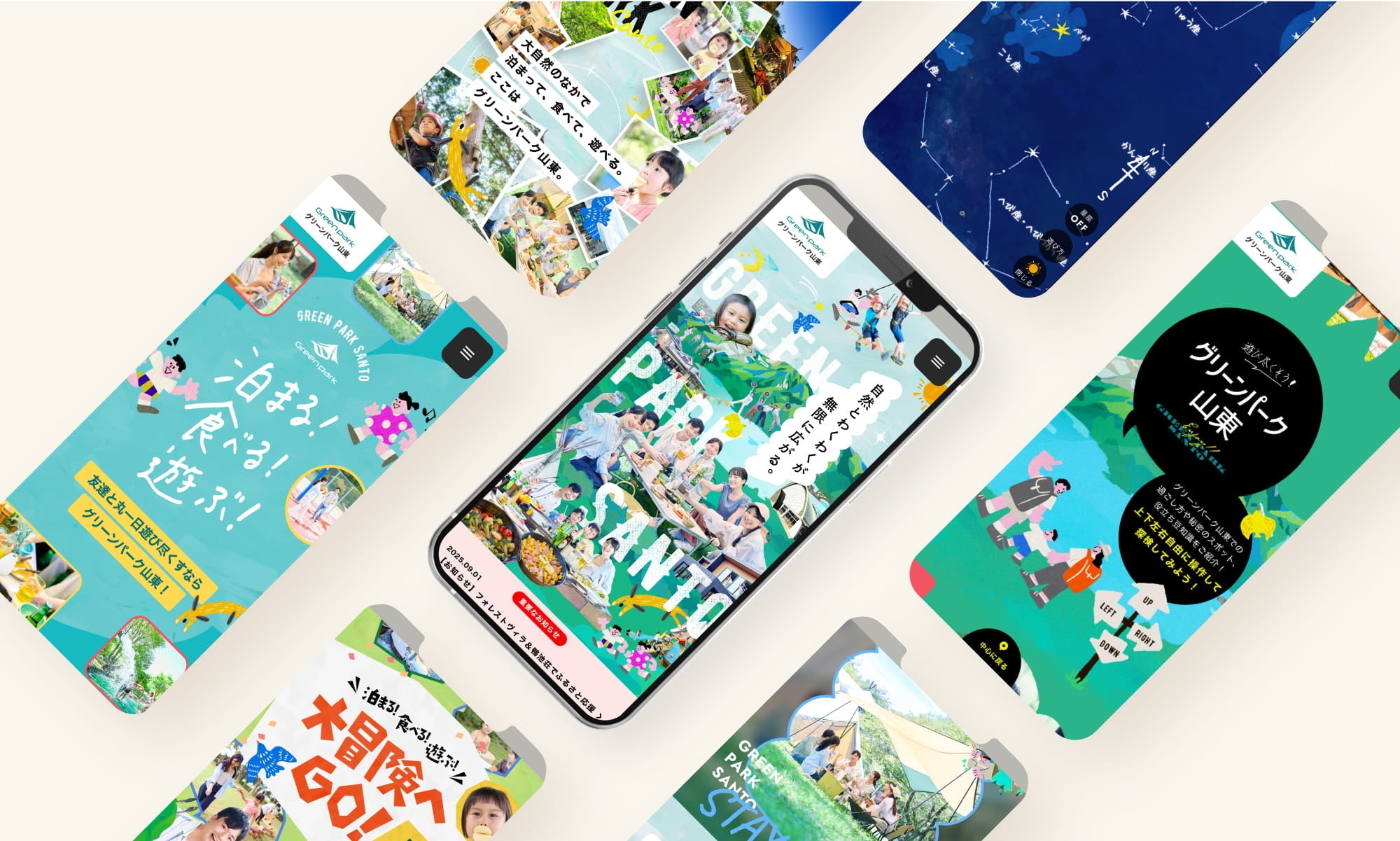 「グリーンパーク山東」のWebサイトは、「自然とわくわくが無限に広がる!」をコンセプトに、20以上の施設が集まる複合公園を一目見ただけで「わくわく!」「楽しい!」と感じてもらうサイトを目指しました。ぜひ、実際にサイトを触って体感してみてください!