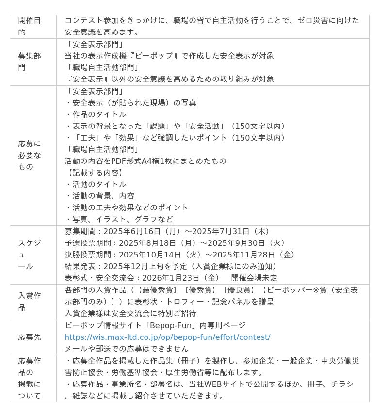 マックス株式会社(証券コード:6454)は、第8回「安全表示・人づくりコンテスト」を開催します。職場の安全意識を高めるために表示作成機『ビーポップ』で作成した安全表示を対象とする「安全表示部門」、安全表示以外の職場の自主活動・取り組みを対象とした「職場自主活動部門」の2部門を募集します。募集は、6月16日(月)から7月31日(木)までWEBサイトでのみ受け付けます。