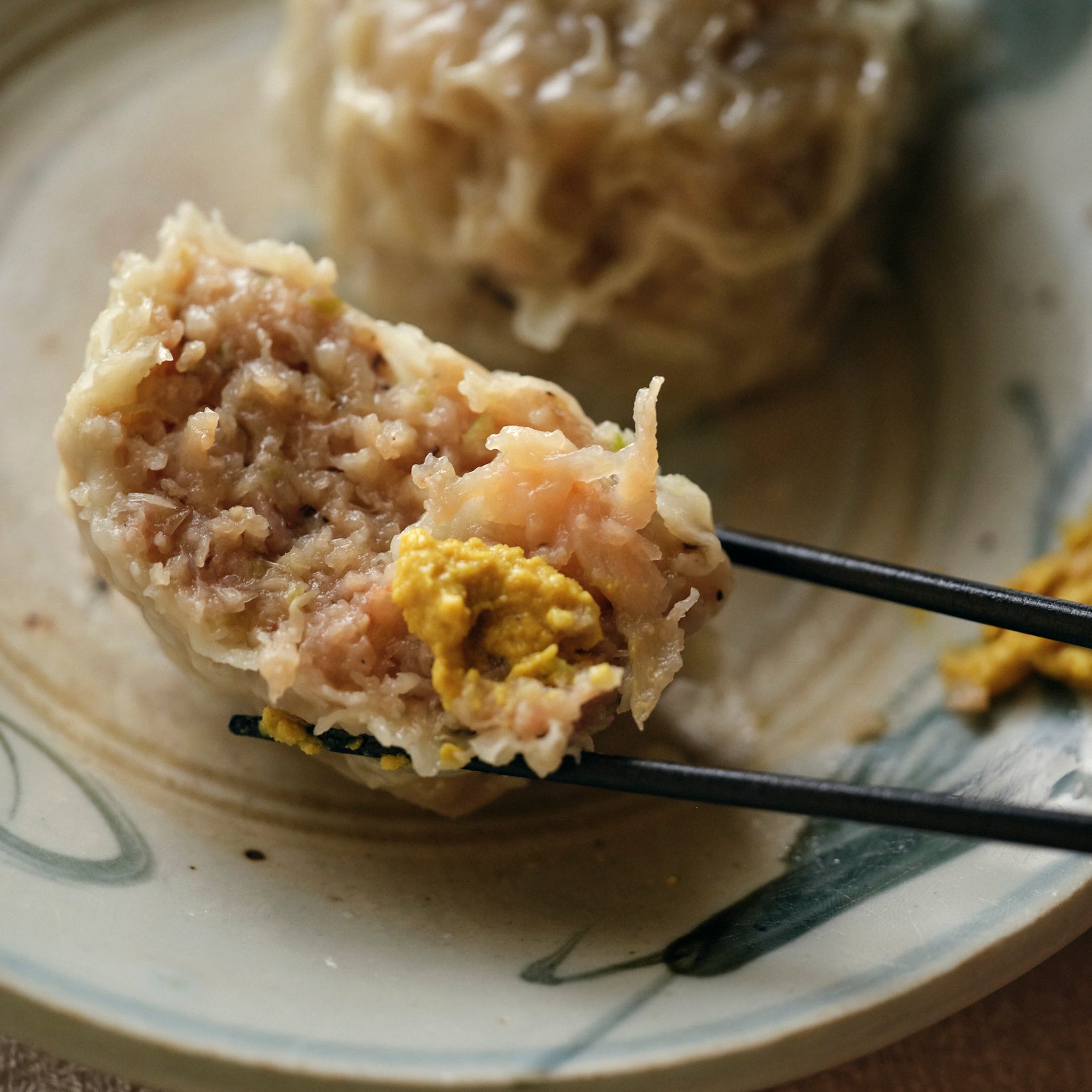 名物料理のジャンボシュウマイは、ボリューム満点の肉だねを皮2枚で包んで