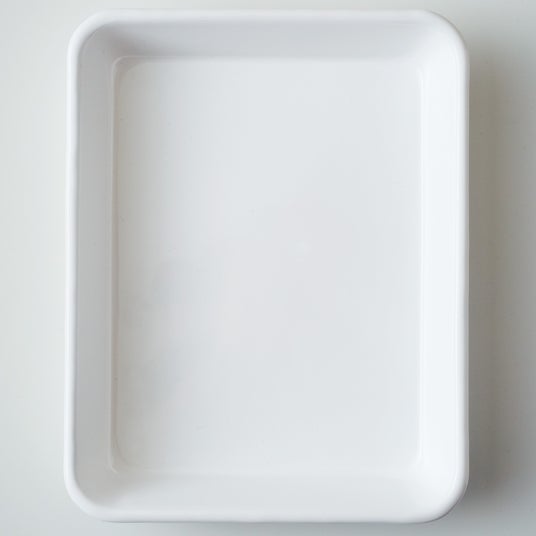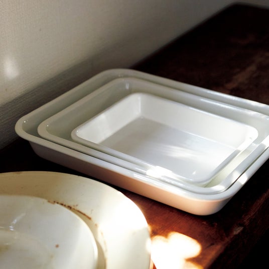 使うのは…料理の下ごしらえに便利なホーローバット。この薄さが、実はお菓子作りにぴったり! 中でも野田琺瑯のキャビネサイズ(20.5~21cm×16~16.5cm×深さ3cm)が、家族2~4人にぴったりの食べきりサイズで使い勝手抜群です。