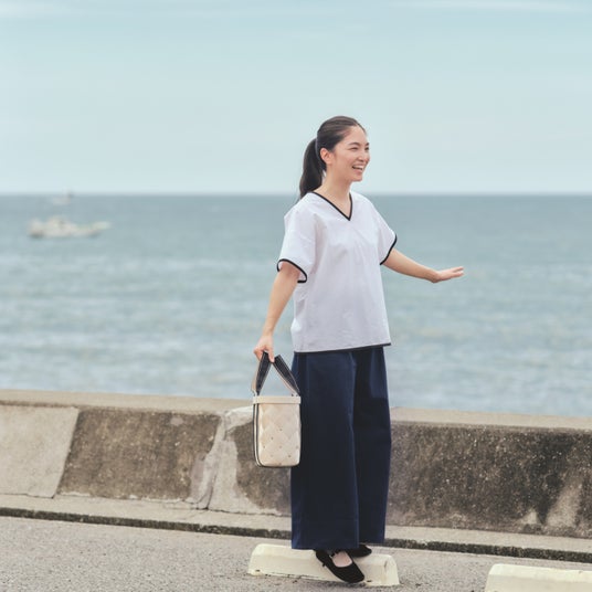 引田かおりさん「Vネックブラウス」 河村奈穂さん「マリンパンツ」