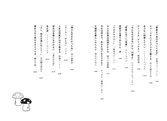 忙しく働いていた母を思い出すミートソース缶。粋な生き様を見せてくれた祖母に会える気がするあじの干物。初めて料理に挑戦した父が懸命に作ったチャーハン。他人に流されず、独特のものさしを持つ彼女がつい浮かぶ東京の銘菓――。