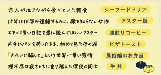 例えば、複雑な事情を抱える彼女との別れの朝食となったシーフードドリアと白ワイン。ジャンボモナカを電話越しで一緒に食べた友人との後悔が残る会話。「シェフの気まぐれサラダ」「お任せメニュー」がどうしても頼めない女性が選んだ人生のパートナー。「きれいに騙されたい」とこぼす後輩が夢中になる風俗嬢のお弁当。冷えてチーズが固まったピザトーストを片手に、初めて見た母の涙……。