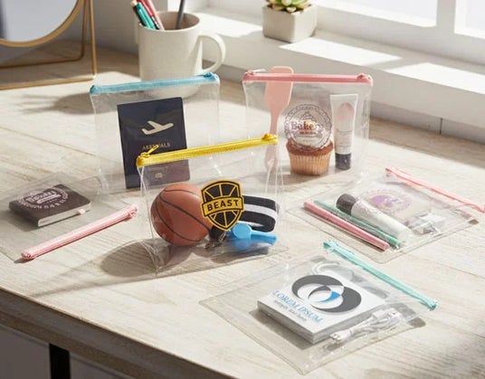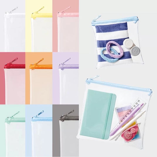 PVC素材で丈夫&防水!カラフルなファスナーがアクセントのクリアポーチを、販促・ノベルティ・ファングッズ・記念品にぴったりなデザインで作成できます。