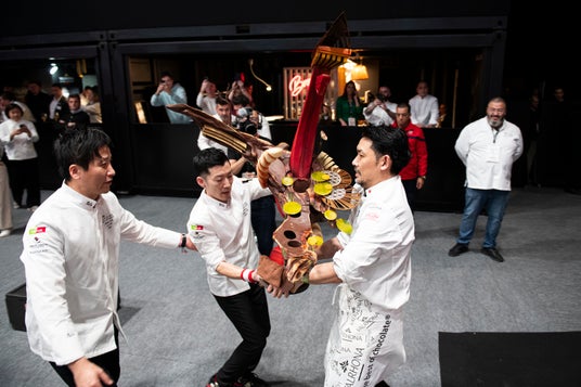 第19回目となる2025年大会では、各大陸予選を勝ち抜いた18か国が参加し、2日間にかけて行われました。大会総合テーマ「National Heritage(国家遺産)」のもと、日本チームは「日出ずる国~Land of the Rising Sun~」をテーマに、独楽をモチーフとしたフローズンデザートや、伝統的な麻の葉模様を取り入れた繊細なレストランデザート、会場を巻き込んだ太鼓のパフォーマンスを盛り込んだショーショコラ、今にも動き出しそうな力強く迫力満点の飴細工・チョコレート細工・氷彫刻の作品を9時間でつくりあげました。
