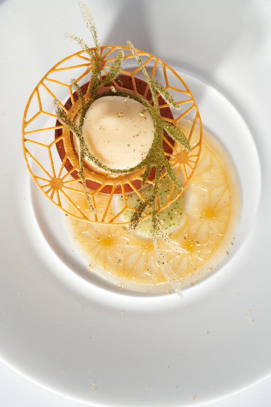 レストランデザートでは、石川県能登半島・あんがとう農園のレモンマリーゴールドを使用した爽やかなグラニータと三重県産のマイヤーレモンのクリーム、ジューシーな洋梨を使用。レモンマリーゴールドが栽培された、石川県能登半島は「能登の里山里海」として日本で初めて世界農業遺産として指定された自然環境の豊かな場所です。コンクールではあまり扱われたことのない珍しい素材でしたが、令和6年能登半島地震を受け、レモンマリーゴールドを使用することで少しでも地域のサポートになればと使用を決めました。パッションとライチを合わせたような独自の香りと味のバランスにこだわり、日本の美の象徴である伝統的な麻の葉模様を取り入れ、エレガントな一皿に仕上げました。