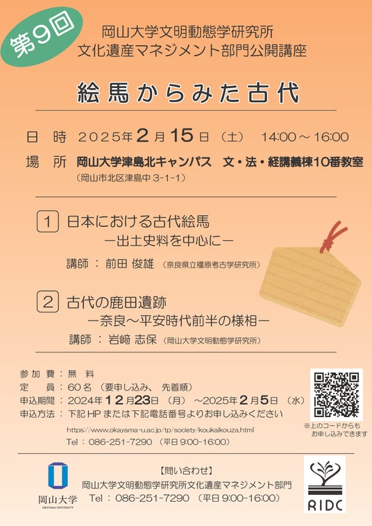 【岡山大学】第9回文明動態学研究所文化遺産マネジメント部門公開講座「絵馬からみた古代」〔2/15,土 岡山大学津島キャンパス〕