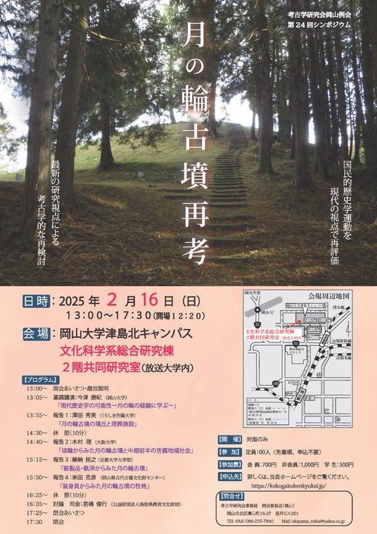 国立大学法人岡山大学(本部:岡山市北区、学長:那須保友)高等先鋭研究院の文明動態学研究所(RIDC)の今津勝紀教授が、2025年2月16日(日)13:00~17:30に本学津島キャンパスで開催される考古学研究会 岡山例会 第24回シンポジウム「月の輪古墳再考」で「現代歴史学の可能性ー月の輪の経験に学ぶー」と題して基調講演をします。