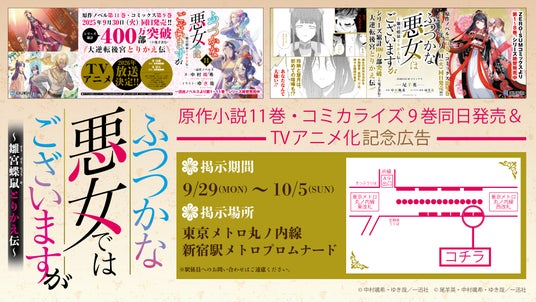 株式会社一迅社(所在地:東京都新宿区 代表取締役社長 野内雅宏)は、『ふつつかな悪女ではございますが ~雛宮蝶鼠とりかえ伝~』(小説:中村颯希/イラスト:ゆき哉/コミック:尾羊英)の原作小説12巻・コミカライズ9巻の同日発売とTVアニメ化を記念して、東京メトロ丸ノ内線新宿駅メトロプロムナードに大型広告を掲載いたします。