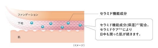 ファンデーション塗布時に、下地とファンデーションが混ざりにくい均一な塗膜を肌上に形成する、独自開発「スキンプロテクト膜」を採用。みずみずしく肌に密着し、ファンデーション※2による肌へのごわつき負担を抑えます。また、ファンデーションののりをよくし、毛穴や肌の凹凸をぼかしながら自然なツヤと明るさを肌に与え、美しく仕上がります。さらに、潤い成分(セラミド機能成分※3、ユーカリエキス、アスナロエキス)も配合。セラミドケア※4により日中も潤った肌が持続します。