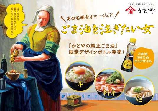フェルメールの代表作「牛乳を注ぐ女」をオマージュした『ごま油を注ぎたい女』がパッケージに!かどやの純正ごま油「限定デザインボトル」が数量限定で1月15日より発売