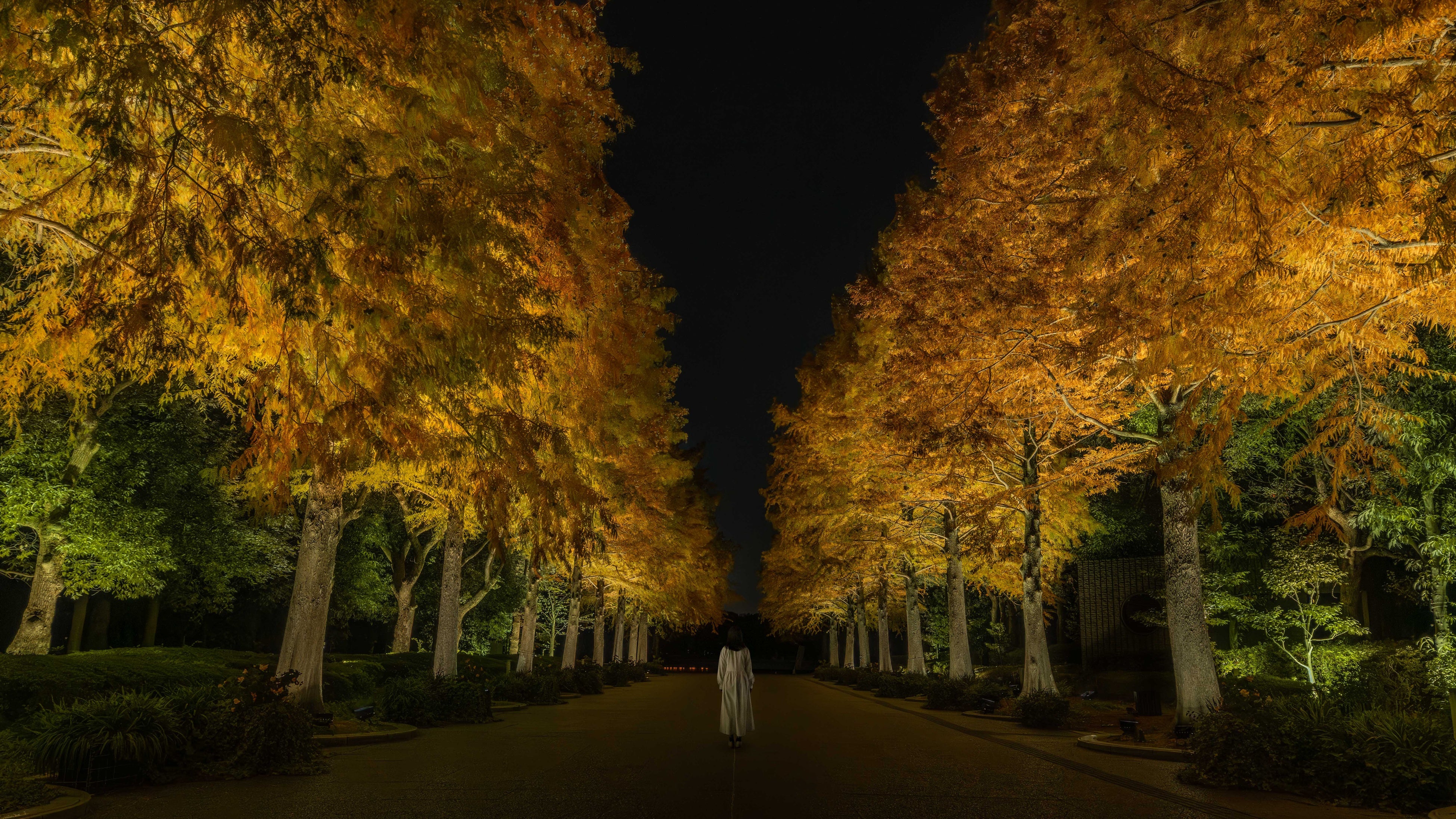 人々や動物が近くを通ると光を輝かせ、音色を響かせ、その周辺の木々も次々に呼応していく作品《呼応する木々 - フウ》は、紅葉したフウの木々に合わせた色で輝きます。《ラクウショウ並木》の木々は、秋の色に色づいています。