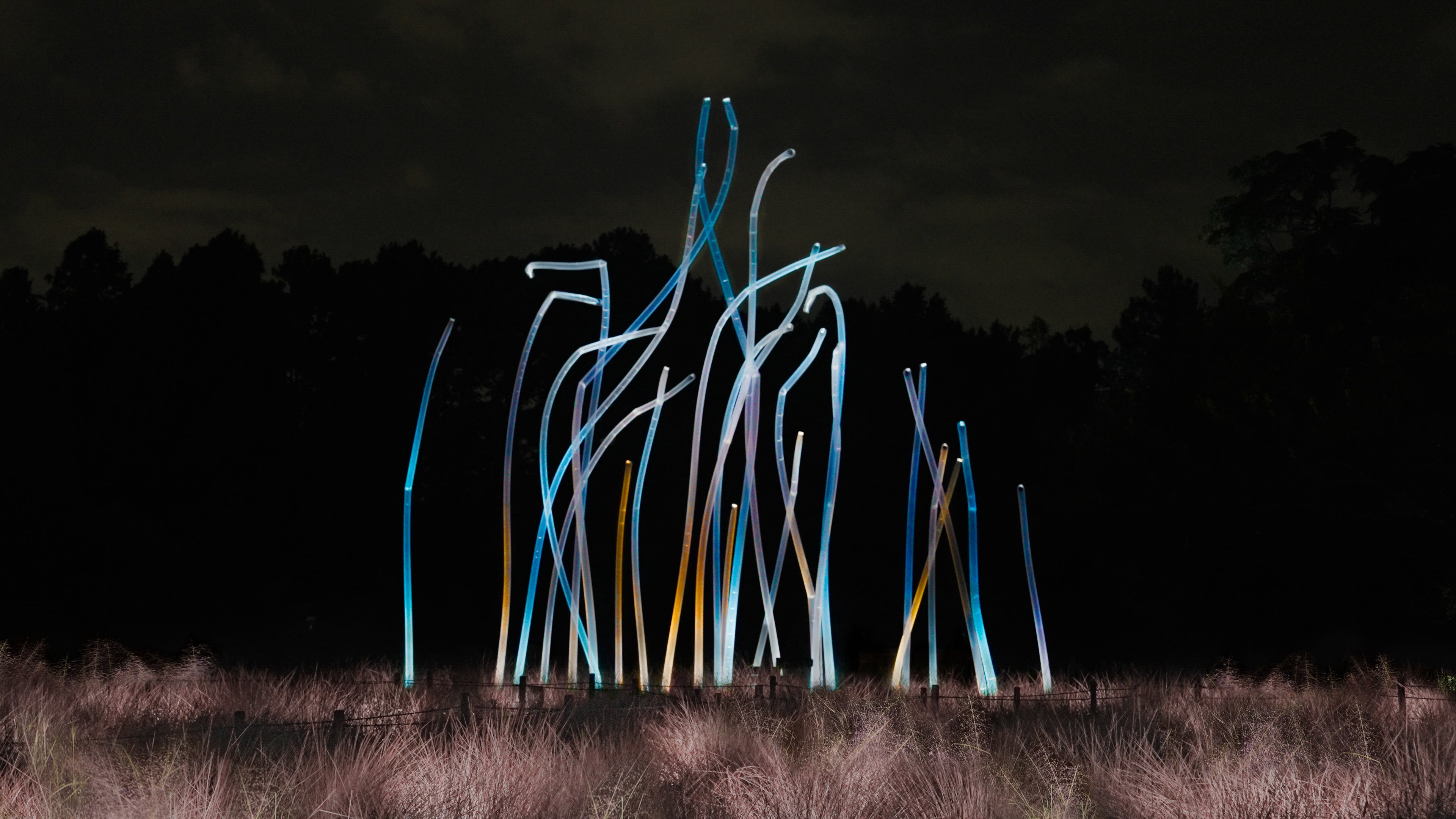 チームラボ《風と共に踊る柱群》、《光色の草原 - カピラリス》(C) チームラボ