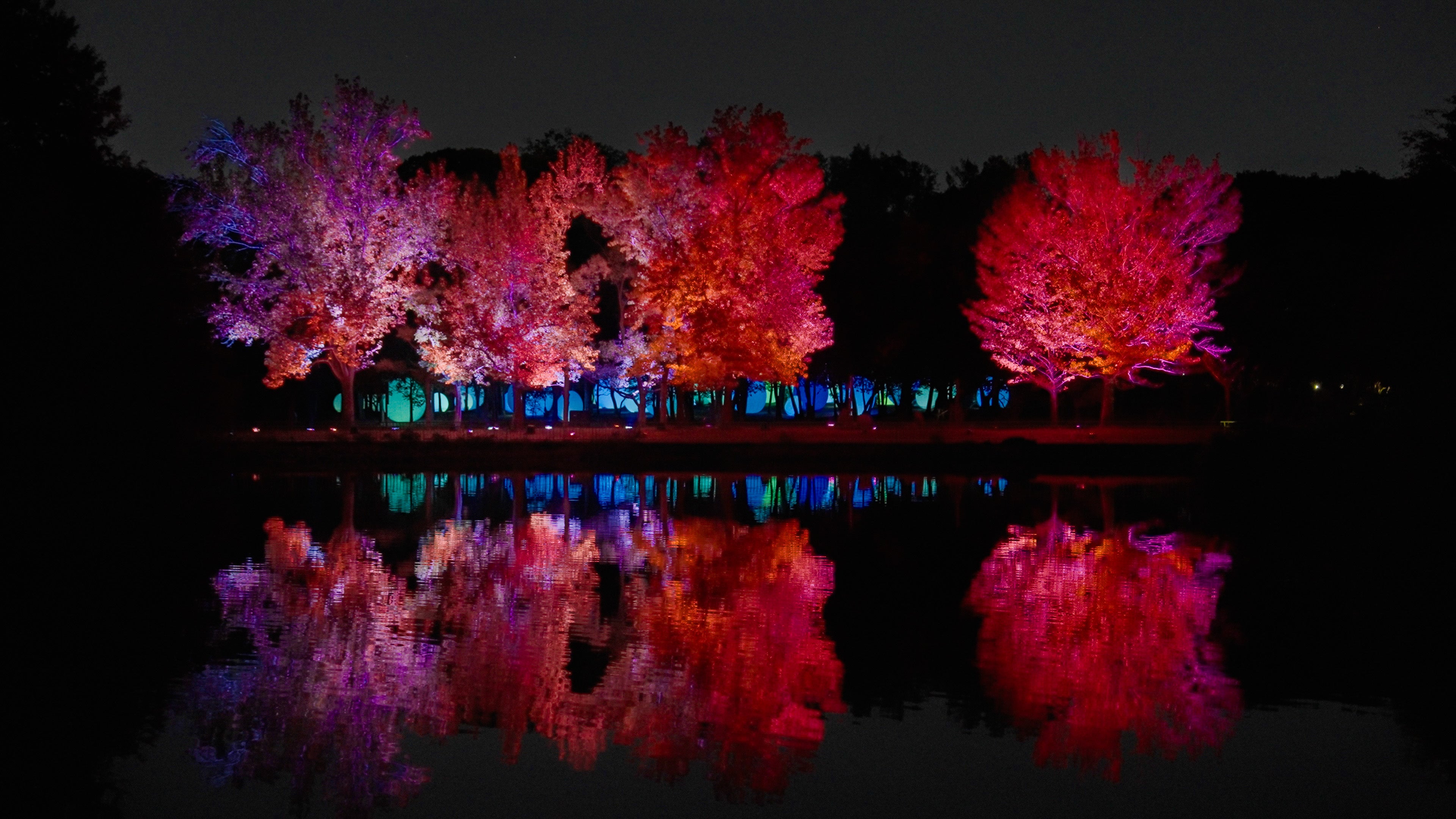 「チームラボ ボタニカルガーデン 大阪」、紅葉が見頃を迎え秋の景色に。《呼応する木々 - フウ》は紅葉に合わせた色で光輝き、《ラクウショウ並木》の木々は秋の色に。