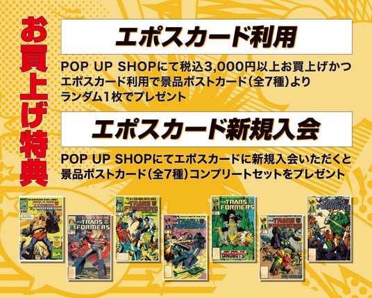 POP UP SHOPでエポスカードをご利用いただくと、税込3,000円以上のお買い上げで、アメリカンコミックアートのポストカード(全7種)を、ランダムにて1枚プレゼントといたします。