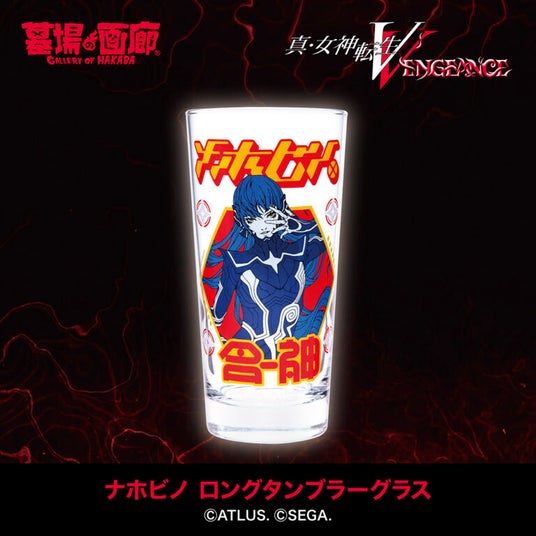ビビッドな配色のナホビノのプリントがインパクト抜群!大容量のロングタンブラーグラスが登場!裏側には『真・女神転生V Vengeance』ロゴが映える!350mlの飲み物が入る使いやすいサイズ感。好きな飲物と一緒にメガテンを楽しもう!
