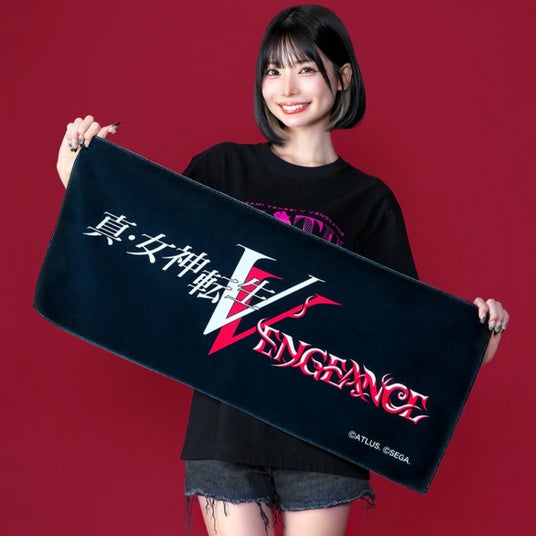 『真・女神転生V Vengeance』のロゴが大胆にプリントされたロゴタオルが登場!そのシンプルさがマニアックなファン心を刺激する!使いやすい大ぶりなサイズと柔らかさで、常に携帯しておきたい逸品。これがあれば毎日悪魔的な日常が送れるかも?