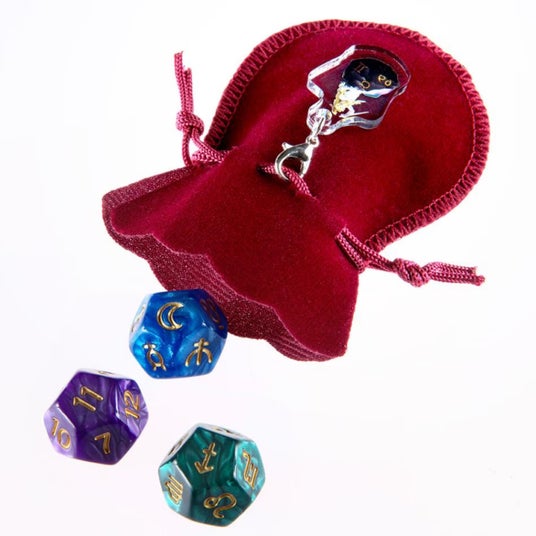12面体サイコロ3個入りの巾着にミトラスのアクリルチャームが付いたセットが登場!12面の星座ダイスと数字ダイスを使って、あなたの運命を占おう!