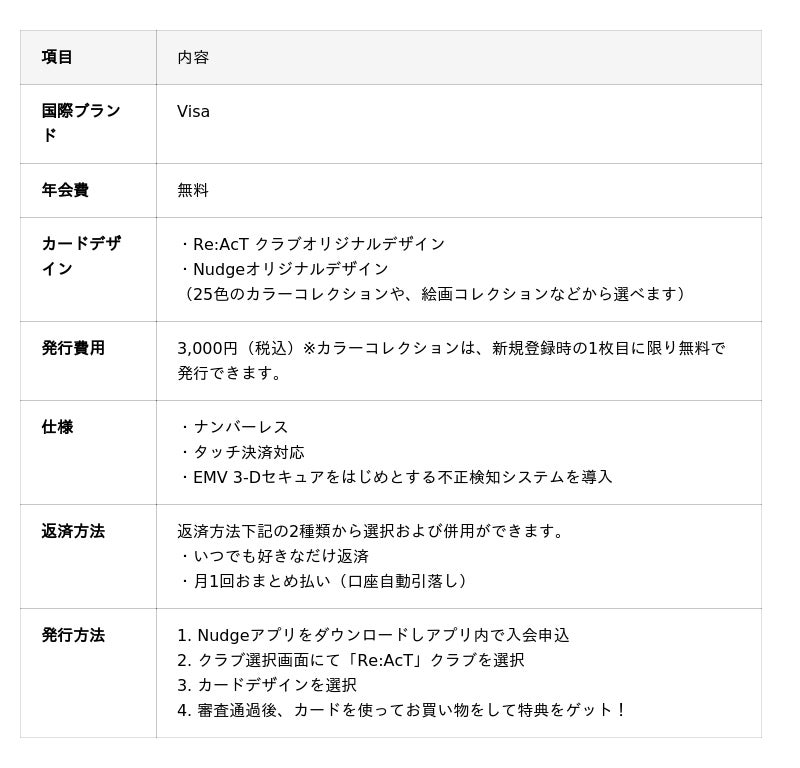 本カードは、日常の買い物を通じて「Re:AcT」を応援できる仕組みで、カードの累計利用額に応じて「Re:AcT」が提供する限定特典や、オリジナルデザインカードをお楽しみいただけます。