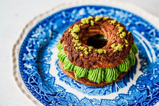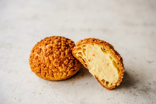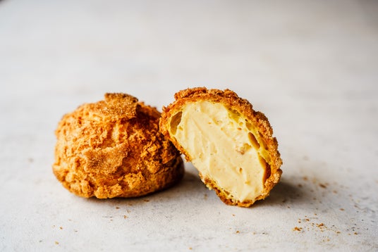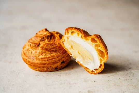 ベース生地にサクッとした食感のシュトロイゼルというサブレ生地を被せて焼き上げています。焼きたてはもちろん時間が経ってからもサクッとした食感が残り、クリームは、「クレーム・ディプロマット」と呼ばれるカスタードにバターと生クリームを合わせたものを絞りました。しっかりとしたシュー生地に負けない、芳醇な味わいです。