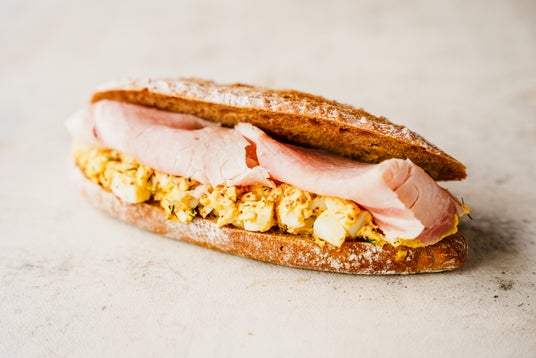 私たち、シャルキュトリ(豚肉の加工品)も出来るんです。サンドイッチに使用するハムは、千葉県産の豚肉をMAISON CLASSIC FACTORY内で加工し、1週間以上かけて作った自然な旨みとしっとりとした食感が特徴です。エッグサラダは卵の風味が消えないようにマヨネーズの量は極力控え、粒マスタードやディルといったハーブを加えて作ります。保存料無添加の自家製ハムとローファット&ハイプロテインのエッグサラダ。美味しくて身体にも良いサンドイッチが完成しました。