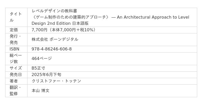 株式会社ボーンデジタル(本社:東京都千代田区、CEO:新 和也、URL:https://www.borndigital.co.jp)は、 『レベルデザインの教科書〈ゲーム制作のための建築的アプローチ〉 ― An Architectural Approach to Level Design 2nd Edition 日本語版』(著:クリストファー・トッテン)を2025年6月下旬に発売いたします。