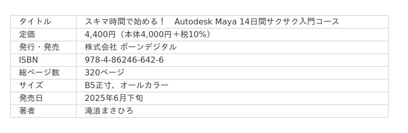 株式会社ボーンデジタル(本社:東京都千代田区、CEO:新 和也、URL:https://www.borndigital.co.jp)は、 『スキマ時間で始める! Autodesk Maya 14日間サクサク入門コース』(著:滝浪まさひろ)を2025年6月下旬に発売いたします。