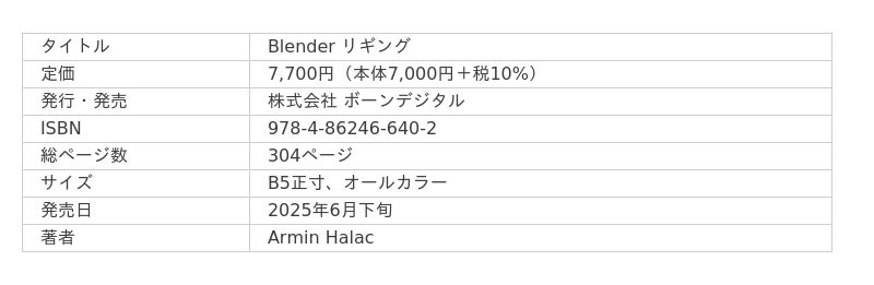 株式会社ボーンデジタル(本社:東京都千代田区、CEO:新 和也、URL:https://www.borndigital.co.jp)は、 『Blender リギング』(著:Armin Halac)を2025年6月下旬に発売いたします。