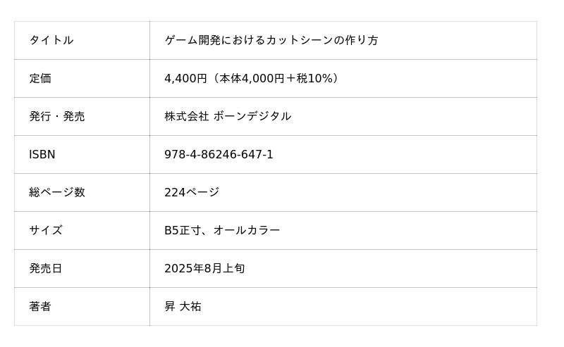 株式会社ボーンデジタル(本社:東京都千代田区、CEO:新 和也、URL:https://www.borndigital.co.jp)は、 『ゲーム開発におけるカットシーンの作り方』(著:昇 大祐)を2025年8月上旬に発売いたします。