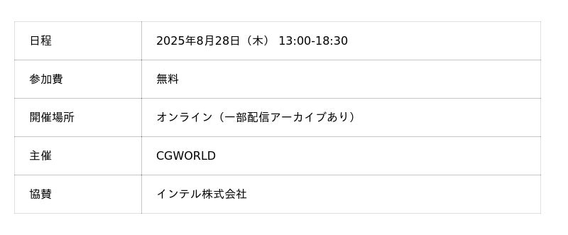 株式会社ボーンデジタル(本社:東京都千代田区、CEO:新 和也、URL:https://www.borndigital.co.jp)が運営する、CG・映像制作の専門メディア「CGWORLD」は、インテル株式会社の協賛のもと、2025年8月28日(木)にオンラインイベント「Intel Boot Up -Creative Sparks Begin Here!-」を開催いたします。