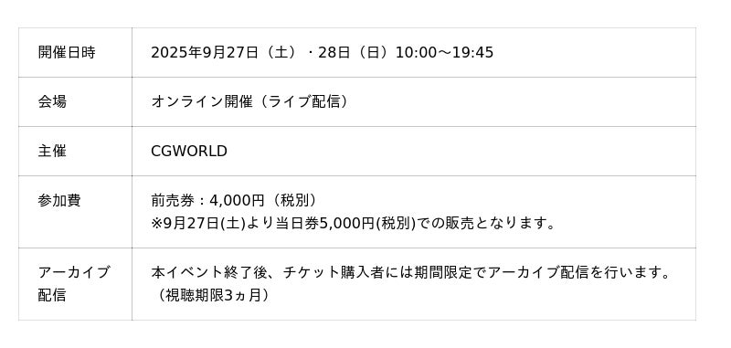第5回目となる今回は、2025年9月27日(土)・28日(日)の2日間にわたりオンラインで実施。キャラモデリング・イラスト・アニメ・VFXなど、多彩な分野を網羅し、初級者から上級者まで幅広い層が楽しめる全16セッションをお届けします。