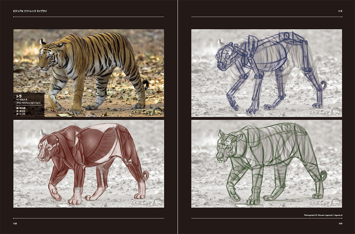 「ビジュアルリファレンス ライブラリ」では、圧倒的な動物写真の数々に アーティスト Shannon Beaumont (シャノン・ボーモン) が 骨格構造、筋肉組織、輪郭形態を詳細に重ねたイラストを収録。50体ほどの多様な動物の造形美を網羅した膨大なコレクションです。