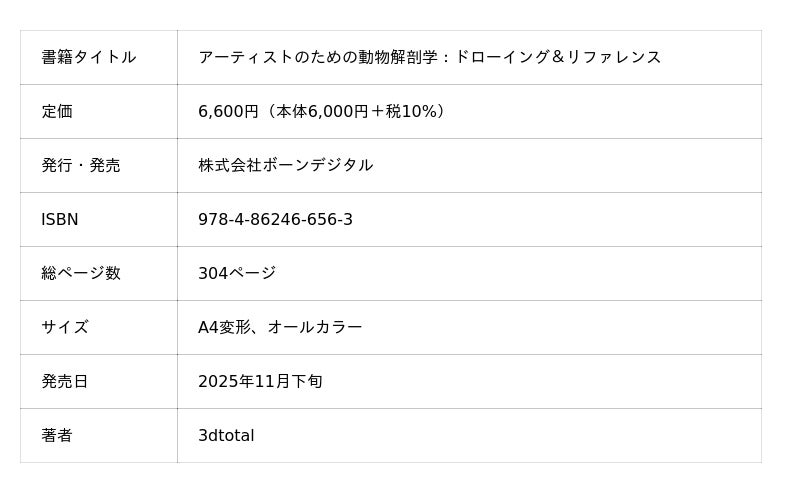 株式会社ボーンデジタル(本社:東京都千代田区、CEO:新 和也、URL:https://www.borndigital.co.jp)は、『アーティストのための動物解剖学:ドローイング&リファレンス』(著:3dtotal)を2025年11月下旬に発売いたします。